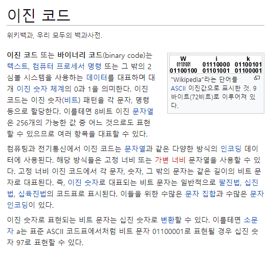1. 바이너리 코드 : 컴퓨터가 인식가능한 0과 1로 구성된 이진코드.